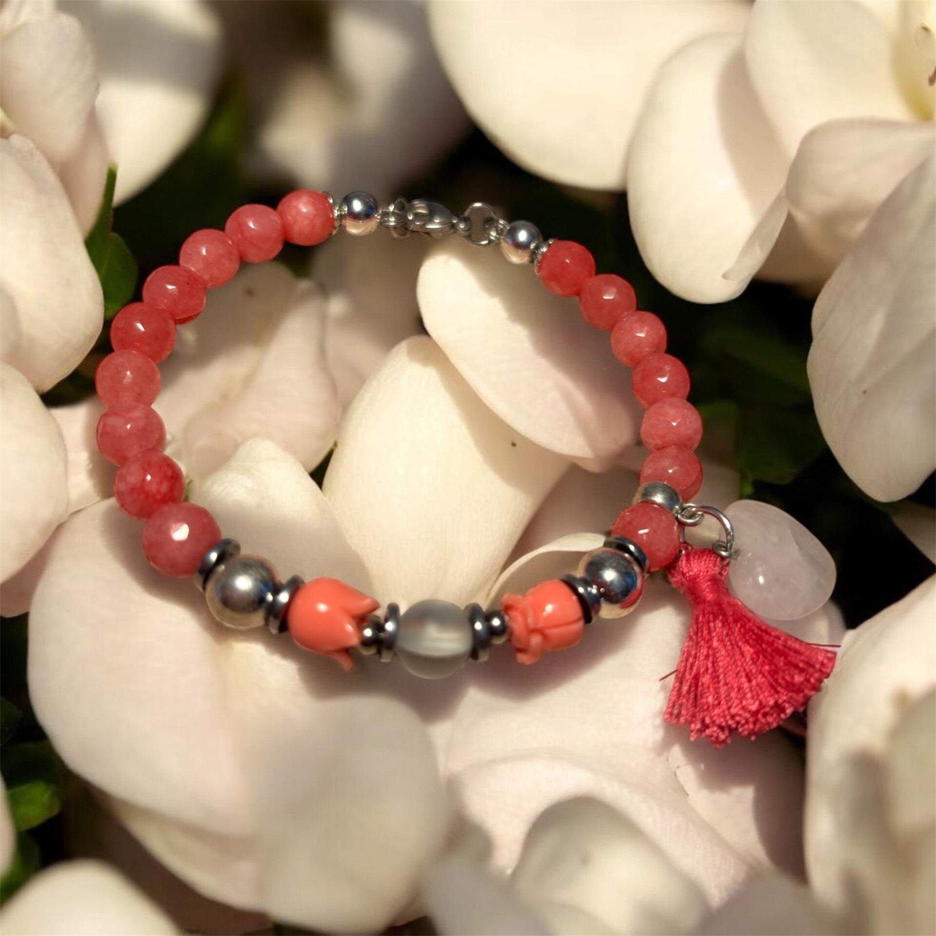 Bracelet Quartz Rose Fraise & Hematite & Pierre De Lune